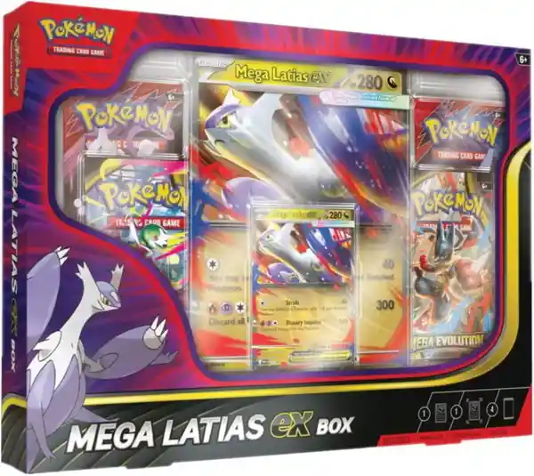 Contiene 5 Unidades. - La Megaevolución Eleva el Poder Del Pokémon Legendario Latias Más Allá de Sus Propios Límites! Gracias a su Asombrosa Velocidad Mega-Latias ex Surca Los Cielos Con Dominio Dracónico Para Aterrizar en tu Colección en Forma de Carta Promo Holográfica Lista Para Jugar y de Carta Lenticular Jumbo Con Increíbles Ilustraciones. También Conseguirás 4 Sobres de Refuerzo Con Muchos Más Pokémon!