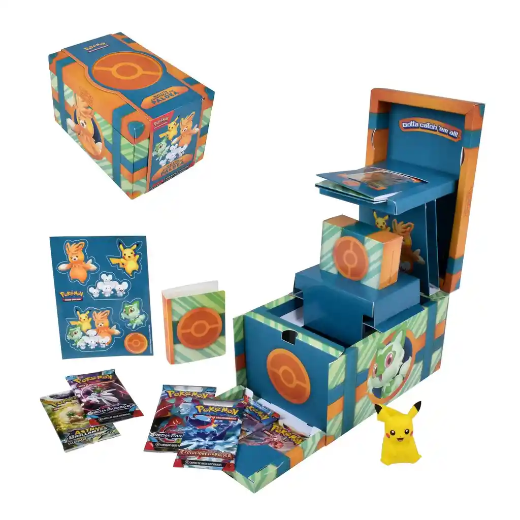 Set contiene: • 7 cartas holográficas de promoción de Pikachu, Sprigatito ex, Pawmi, Pawmo, Pawmot ex, • Tandemaus y Maushold ex • 1 hoja con pegatinas especiales • 1 miniálbum • 1 muñeco blandito de Pikachu • 6 paquetes de mejora de JCC Pokémon • 1 carta con código para JCC Pokémon Live"