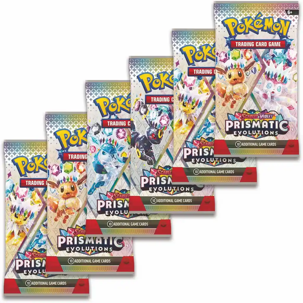 La colección especial con bolsa para accesorios de Escarlata y Púrpura-Evoluciones Prismáticas de JCC Pokémon contiene: 1 divertida bolsa para accesorios de Eevee 5 paquetes de mejora de Escarlata y Púrpura-Evoluciones Prismáticas de JCC Pokémon