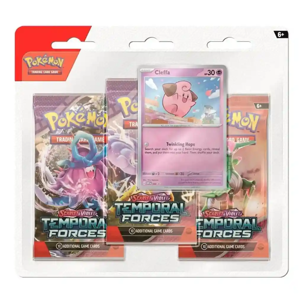 Los poderes antiguos y futuros perduran! Las filas de Pokemon antiguos y futuros siguen creciendo! Walking Wake ex se libera del pasado junto con Raging Bolt ex, mientras que Iron Leaves ex ofrece justicia de alta tecnologia con Iron Crown ex. Fuera del Area Cero, Wugtrio y Farigiraf cambian de tipo como Tera Pokemon ex, y los Entrenadores Pokemon de todo el mundo se preparan para el regreso de las cartas ACE SPEC con efectos excepcionalmente poderosos. Una ruptura en el tiempo trae bestias salvajes y visiones ciberneticas a la batalla en la expansion Pokemon TCG: Scarlet amp; Violetmdash;Temporal Forces. <li>Cada blister de 3 paquetes de Fuerzas Temporales Escarlata y Violeta de JCC Pokemon contiene 3 paquetes de refuerzo.</li> <li>Cada paquete de refuerzo contiene 10 cartas y 1 energia basica. Las tarjetas varian segun el paquete.</li> </ul> Aprovecha al maximo esta experiencia de juego y sumergete en la emocionante combinacion de antiguos y futuros poderes que ofrece la expansion Temporal Forces!