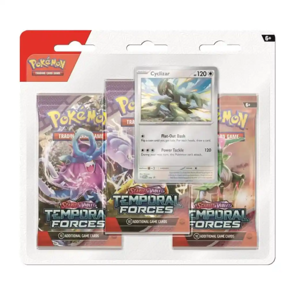 Los poderes antiguos y futuros perduran! Las filas de Pokemon antiguos y futuros siguen creciendo! Walking Wake ex se libera del pasado junto con Raging Bolt ex, mientras que Iron Leaves ex ofrece justicia de alta tecnologia con Iron Crown ex. Fuera del Area Cero, Wugtrio y Farigiraf cambian de tipo como Tera Pokemon ex, y los Entrenadores Pokemon de todo el mundo se preparan para el regreso de las cartas ACE SPEC con efectos excepcionalmente poderosos. Una ruptura en el tiempo trae bestias salvajes y visiones ciberneticas a la batalla en la expansion Pokemon TCG: Scarlet amp; Violetmdash;Temporal Forces. <li>Cada blister de 3 paquetes de Fuerzas Temporales Escarlata y Violeta de JCC Pokemon contiene 3 paquetes de refuerzo.</li> <li>Cada paquete de refuerzo contiene 10 cartas y 1 energia basica. Las tarjetas varian segun el paquete.</li> </ul> Aprovecha al maximo esta experiencia de juego y sumergete en la emocionante combinacion de antiguos y futuros poderes que ofrece la expansion Temporal Forces!