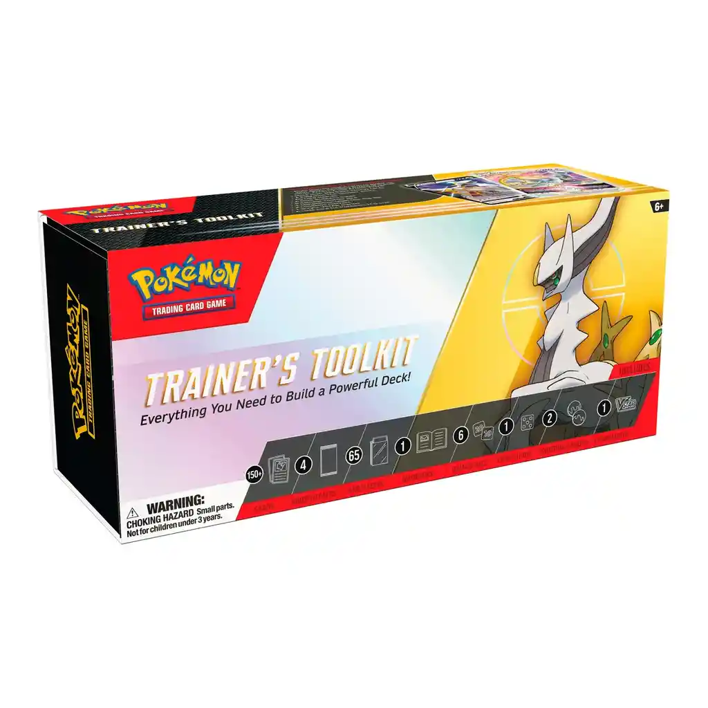 La caja de Herramientas de Entrenador de JCC Pokémon contiene:• Más de 50 valiosas cartas para dar más poder a tus barajas, incluidas montones de cartas de Entrenador, y cartas de Arceus V y Arceus V-ASTRO• Más de 100 cartas de Energía Básica• 4 paquetes de mejora de JCC Pokémon• 65 fundas para cartas• 1 guía para construir barajas• 6 dados a modo de contadores de daño• 1 dado para lanzamiento de moneda válido para competiciones legales• 2 marcadores de condición• 1 marcador V-ASTRO acrílico• 1 carta con código para JCC Pokémon Live"