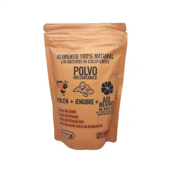 Suplemento natural que contiene polen, jengibre y ajo negro. Ingredientes: Polvo de ajo negro 30%, Raíz de Jengibre 40% Pole en polvo 30%. Modo de consumo: 1 a 2 porciones diarias en yogurt, granola, cereales, batidos, jugos, postres, snacks, pan, galletas o en lo que prefieras.