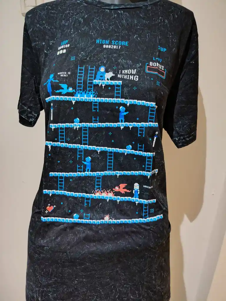 Polera negra con diseño pixelado estilo videojuego retro. Cómoda y con look gamer nostálgico. 🎮 DISPONIBLES, 1 TALLA S Y 1 TALLA M