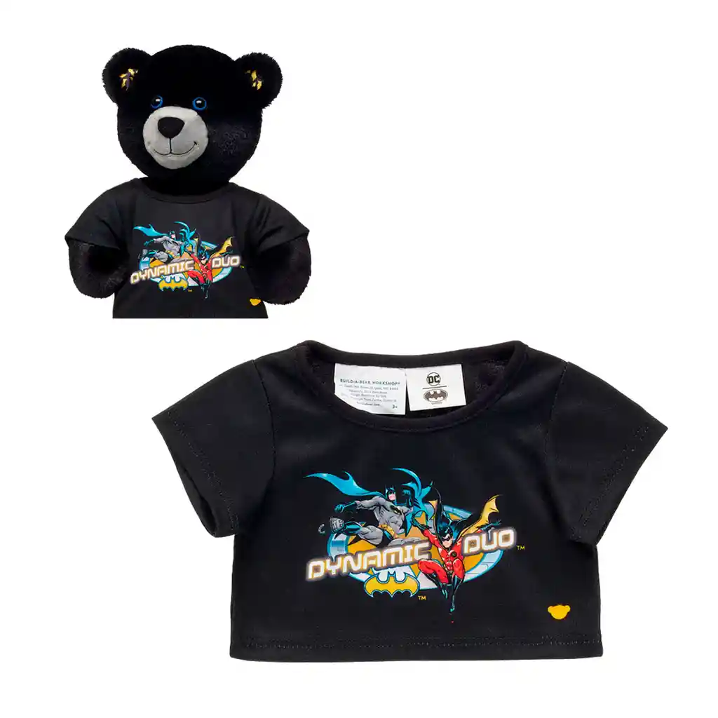 Esta polera Batman Build-A-Bear es una prenda imprescindible para cualquier fan del Caballero de la Noche. Esta camisa está hecha de material suave en color negro y amarillo manga corta, con cuello redondo, y tiene un estampado de Batman y Robin, diseñada especialmente para amigos de peluche Build-A-Bear. Completa el regalo perfecto agregando a tu compra esta hermosa polera, siendo esta un atuendo que no puede faltar en el armario de cualquier amiguito peludo ya que es perfecta para combinarla con la amplia gama de atuendos y accesorios para estos amiguitos.