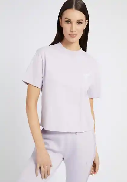 Para Mujer Manga Corta Con Corte Regular y Largo a la Cadera. Diseño en Tono Liso Con Estampado Triangular Guess en Parte Superior Izquierda y Tipografia de Letras Guess en Parte Trasera. Con Cuello Redondo. Materiales: 100% Cotton.