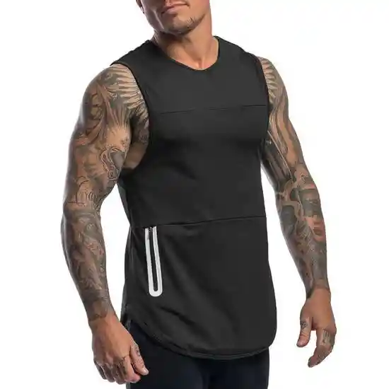 Polera Deportiva Estilo Musculosa Elaborada en Poliéster y Algodón Color Negro. Diseño Sin Mangas Cuenta Con un Bolsillo Con Cierre Ideal Para Objetos Pequeños. Talla L Talla L