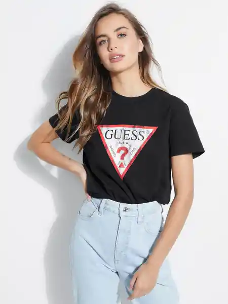 Polera de Mujer Manga Corta y Largo a la Cadera. Diseño Regular de Tono Liso Con Cuello Redondo y Logotipo Triangular Guess Estampado a la Altura Del Pecho. Materiales: 100% Cotton.