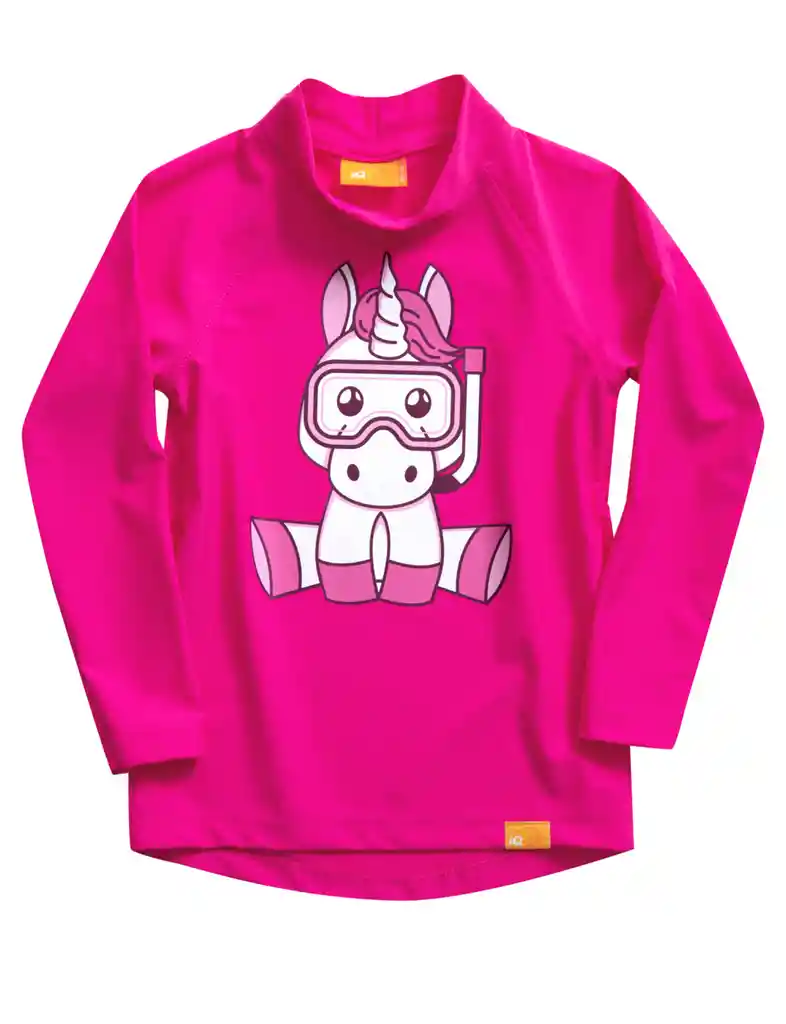 Considera una estatura de 111-122 cm de altura. Polera manga larga diseño unicornio, está fabricada en Europa por la marca alemana IQ y tiene filtro solar UV UPF 300+. Este filtro bloquea sin químicos, más del 99% de los rayos ultravioleta tipo A y B (UVA y UVB). Está confeccionada con un hilado italiano, producido en un 78% poliamida (nailon reciclado) y 22% laicra extra live. Esta tela además protege contra las medusas y otras especies. La tela es respirable, ultraligera y de secado rápido. Tiene una gran elasticidad para que tu hijo(a) tenga máxima libertad de movimientos sin dejar de protegerlo(a) en todo momento. No se encoge ni pierde el color con el tiempo o los lavados. IQ es una empresa alemana y todos sus productos están certificados por importantes entidades en lo que respecta a seguridad y protección contra los rayos UV: * Certificado por el TÜV alemán * Ropa libre de químicos: Certificado Oeko-Tex Standard 100 * Certificación Australiana/Neozelandés (AZ/NZ 4399:1996) * Certificación Comunidad Europea (CE) * Ropa con filtro UV segura para la salud: Certificación ISO 13758-2 La polera manga larga fucsia es fácil de cuidar, para lavarla, solo ponla en la lavadora, sin suavizante y el agua a no más de 40 grados de temperatura. Cuando la uses en la piscina o en el mar, recuerda enjuagarla con agua después de cada uso, para que el cloro o las sales marinas, no dañen las fibras de la tela y así dure mucho más.