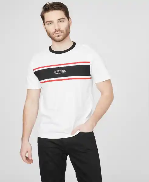 Para Hombre Manga Corta Con Corte Regular y Largo a la Cadera. Diseño en Tono Liso Con Franjas Horizontales Decorativas en Parte Frontal y Bordado de Letras Guess en Parte Central. Con Cuello Redondo. Materiales: 100% Cotton.