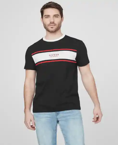Para Hombre Manga Corta Con Corte Regular y Largo a la Cadera. Diseño en Tono Liso Con Franjas Horizontales Decorativas en Parte Frontal y Bordado de Letras Guess en Parte Central. Con Cuello Redondo. Materiales: 100% Cotton.