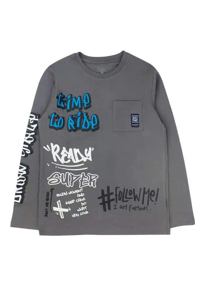 Polera junior niño estampada move 333 Talla: 12 años Género: Niño Modelo :Move Composición: 80% Algodón 20% Poliéster Garantía: 6 meses Cuidados de la prenda: Lavado con agua a tº máxima de 30º. No blanquear. No dejar en remojo. No secar a máquina. No planchar sobre aplicación
