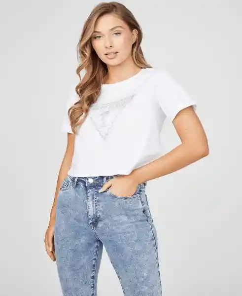 Para Mujer Manga Corta Con Corte Regular y Largo a la Cadera. Diseño en Tono Liso Con Logotipo Triangular Guess Con Pedrería en Parte Frontal y Cuello Redondo. Materiales: 100% Cotton.