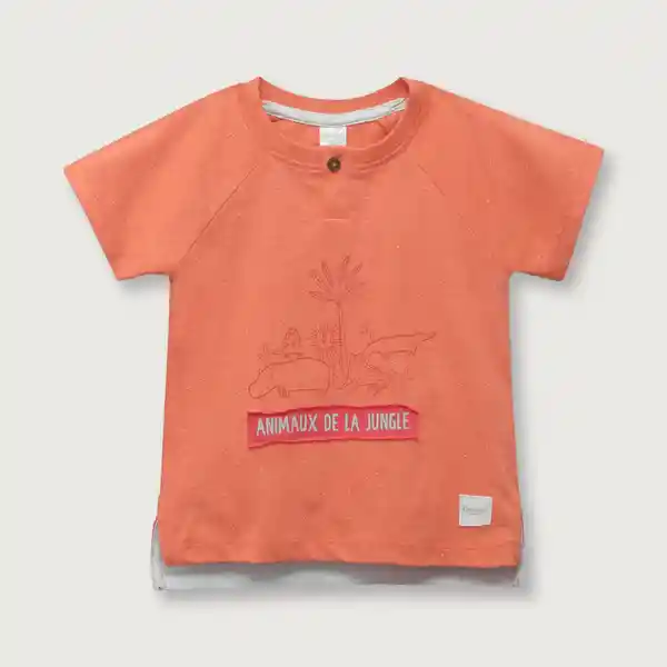Manga Corta Corte Raglan. Cuello Redondo Con Abertura de Broche a Presion en el Centro. Abertura de Talají en Los Costados de la y Con Print de Animales en la Jungla en el Centro Delantero. Color Principal de la Prenda Coral Con Detalles en Gris Melange.
