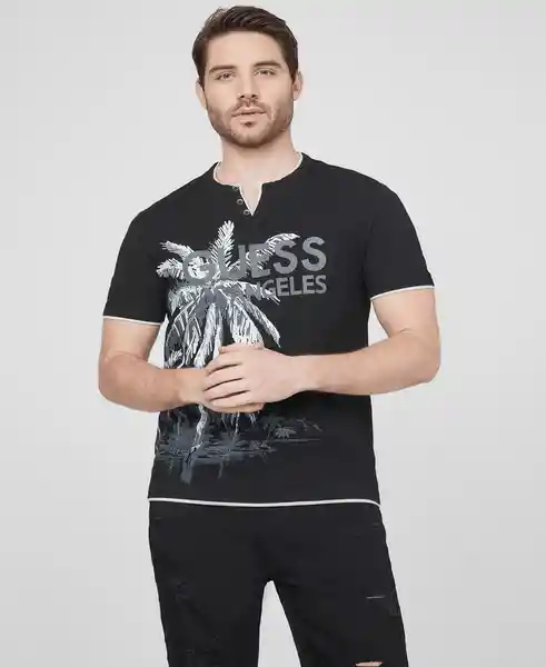 Modelo: X2GP06K0RD2. De Hombre Manga Corta Con Corte Regular y Largo a la Cadera. Diseño en Tono Liso Con Estampado de Palmeras y Tipografía de Letras Guess Los Ángeles en Parte Frontal. Con Cuello V y Cierre de Botones. Materiales: 100% Cotton.