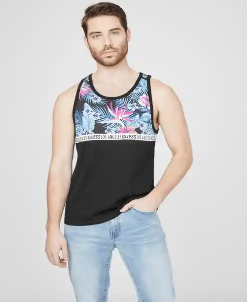 Modelo: X2GP19KAK90. De Hombre Sin Mangas Con Corte Regular y Largo a la Cadera. Diseño en Tono Liso Con Estampado de Plantas en Parte Superior y Tipografía de Letras Guess Los Ángeles en Parte Frontal. Con Cuello Redondo. Materiales: 100% Cotton.