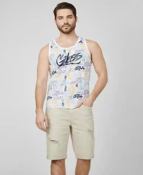 Modelo: X1YP08RAK90. De Hombre Sin Manga Con Cuello Redondo y Largo a la Cadera. Diseño Tipo Musculosa Con Tono Liso y Estampado Tipo Grafiti Con Letras Guess. Materiales: 100% Cotton.