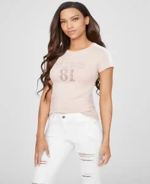 Para Mujer Manga Corta Con Corte Regular y Largo a la Cadera. Diseño en Tono Liso Con Bordado de Letras Guess 81 Con Pedrería en Parte Frontal. Con Cuello Redondo. Materiales: 100% Cotton.