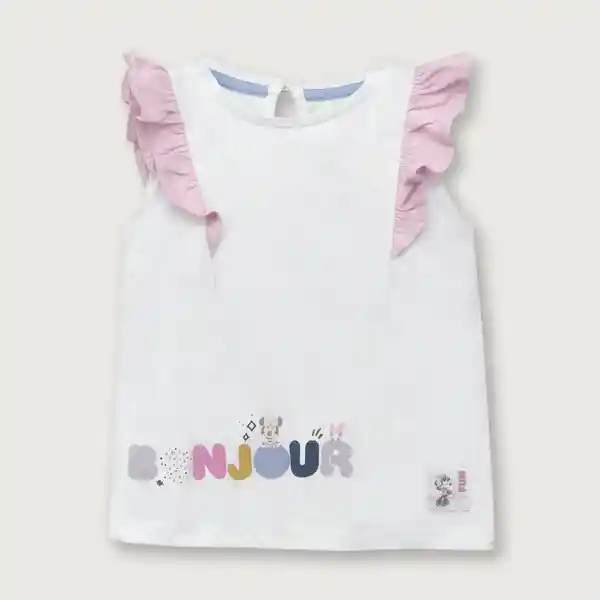 Sin Mangas de Color Blanco Con Estampado Lateral Etiqueta de Cavas Con Print de Minnie Mouse Con Vuelos en el Frente Hombros y Espalda de Popelina en Color Rosado Con Abertura en la Espalda Con Botón.