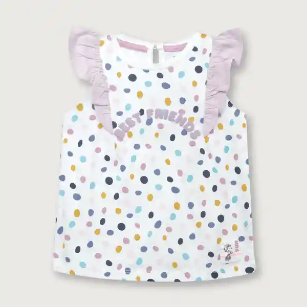 Sin Mangas de Color Blanco Con Estampado Etiqueta de Cavas Con Print de Minnie Mouse Con Vuelos en el Frente Hombros y Espalda de Popelina en Color Lila Con Abertura en la Espalda Con Botón.