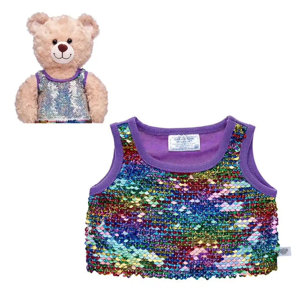 Agrega a tu compra increíbles accesorios y atuendos, para que tu mejor amigo Build a Bear luzca siempre único y adorable. Con esta hermosa Polera sin Mangas tu AmigOso, brillará tanto que lo verán hasta a metros de distancia. Diseñada con detalles totalmente modernos y con la cantidad perfecta de brillo, con las lentejuelas de colores como el arcoíris, las cuales son reversibles al moverlas hacia arriba y hacia abajo. ¿Qué estas esperando? A tu amigo peludo le encantará lucir muy bien mientras disfrutan de inmemorables jornadas de diversión.