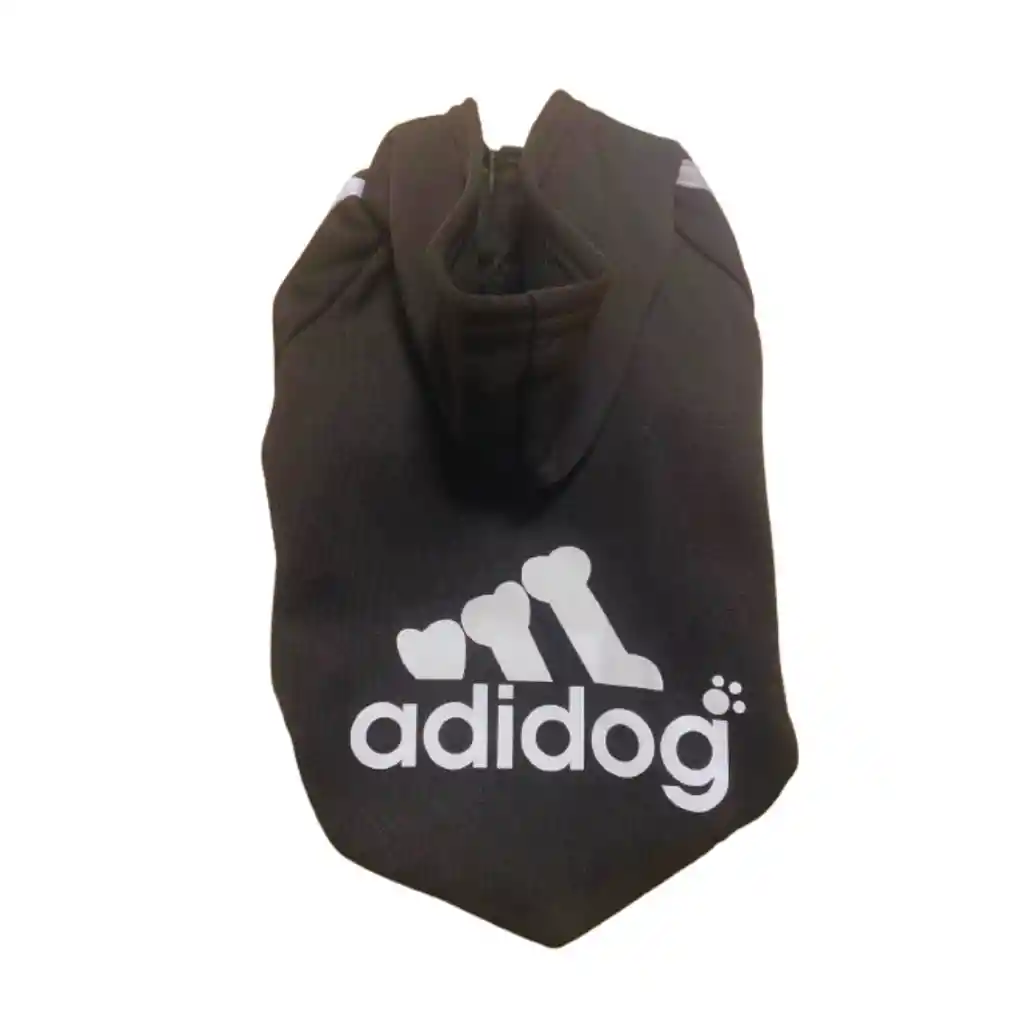 Características: - Polerón con Capucha y estampado con la palabra Adidog - Con polar delgado en su interior. - Tiene mangas que cubren las patas delanteras. - En la parte trasera tiene ligas que se sujetan a las patas traseras para dar mejor firmeza. - Por la parte del cuello tiene un pequeño agujero para conectar el gancho de la correa de paseo. - Perfecto para el frio durante el invierno. Medidas Talla 5XL: Largo: 60 cm; Pecho: 78-85 cm; Cuello: 53-58cm Color: Negro