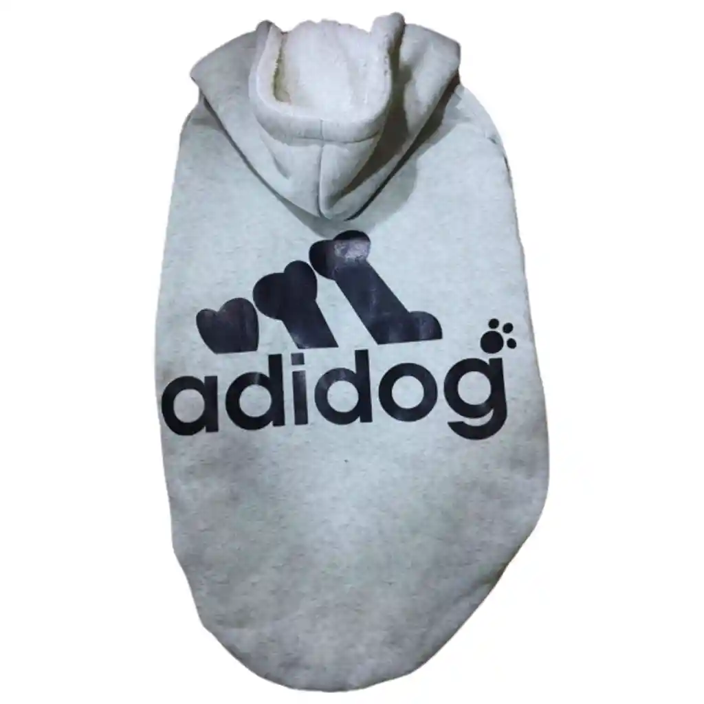 Características: - Polerón con Capucha y estampado con la palabra Adidog - Con chiporro en su interior. - Tiene mangas que cubren las patas delanteras. - En la parte trasera tiene ligas que se sujetan a las patas traseras para dar mejor firmeza. - Por la parte del cuello tiene un pequeño agujero para conectar el gancho de la correa de paseo. - Perfecto para el frio durante el invierno. Medidas Talla 3XL: Largo: 50 cm; Pecho: 70-75 cm; Cuello: 45-50cm Color: Gris