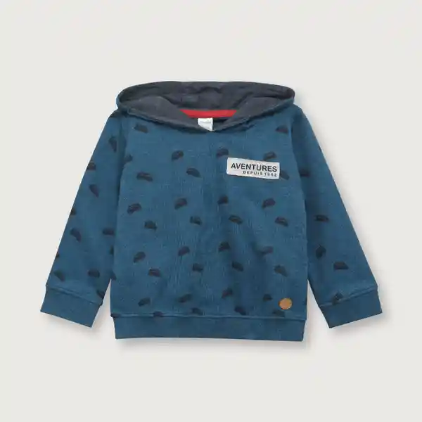 Cerrado Con Gorro. Color Principal Azul Melange Con Estampados de Mini Prints de Aútobus y Parche Gris en el Pecho. Forro en Gorro Color Azul.