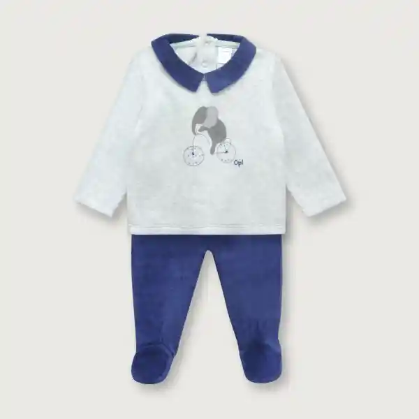Clemente Conjunto de Poleron de Plush Con Cuello Camisero en Color Azul Broches en Espalda y Estampado Central de Elefante. Plush en Color Azul Con Pretina Elasticada Patita Cubierta Con Elastico en Talón Para un Mejor Ajuste.