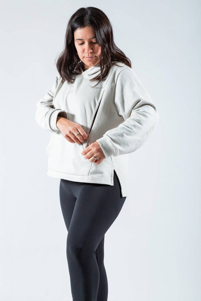 Polerón de Lactancia Hoodie Luz en Beige - Polerón con capucha de calce oversize con cuello redondo en franela algodón, de calidad gruesa y suave al tacto. Diseño de manga larga con cierres laterales a sus costados. Largo trasero mayor con apertura lateral bajo cadera que otorga comodidad y libertad de movimiento. Detalle de logo bordado en gris en el centro.
