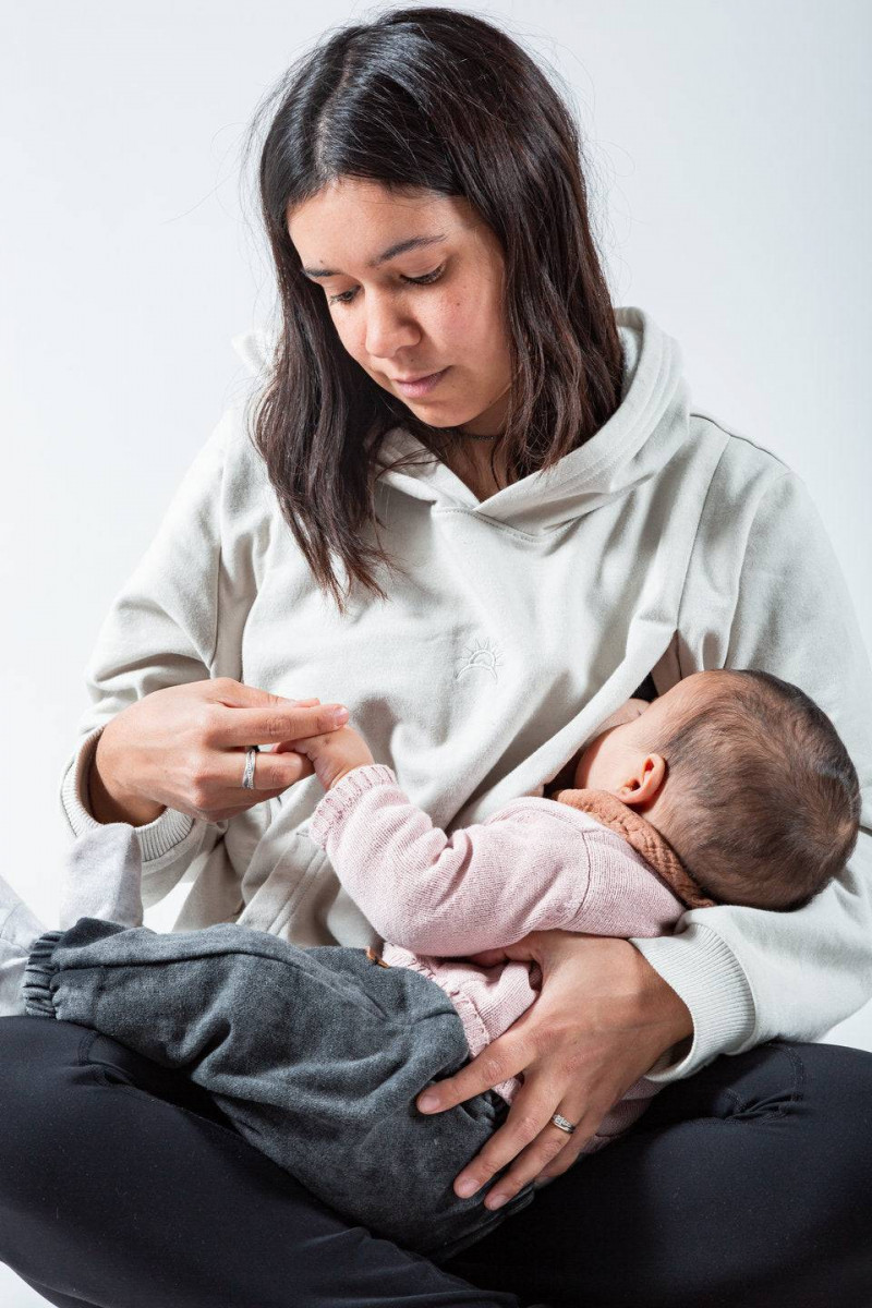 Polerón de Lactancia Hoodie Luz en Beige - Polerón con capucha de calce oversize con cuello redondo en franela algodón, de calidad gruesa y suave al tacto. Diseño de manga larga con cierres laterales a sus costados. Largo trasero mayor con apertura lateral bajo cadera que otorga comodidad y libertad de movimiento. Detalle de logo bordado en gris en el centro.