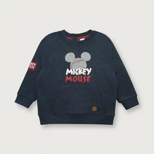 Poleron Manga Raglán Mickey en Color Azul Con Bolsillo Kanguroo. Aplicación Central en Jersey y Texto Con Relieve. Rib en Puño y Cintura Abertura en Espalda Con Snaps.