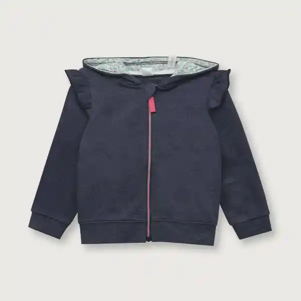 De Buzo Básico de Color Azul Marino Con Abertura Central Con Cierre Detalle de Vuelos en Los Hombros y Gorro Con Estampado en el Interior.
