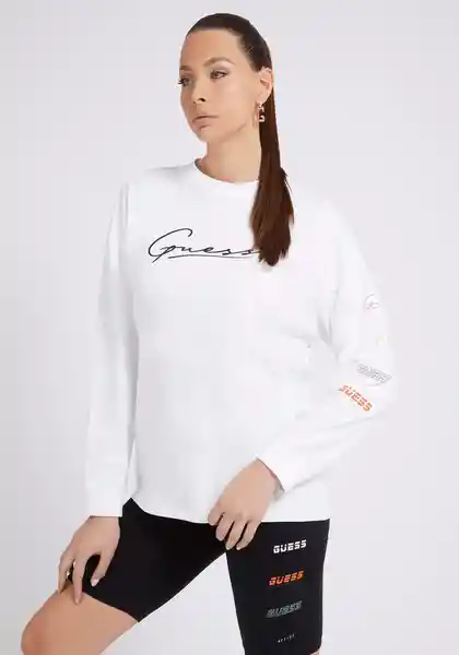Polerón de Mujer Manga Larga Con Corte Regular y Largo a la Cadera. Diseño en Tono Liso Con Tipografía Cursiva de Letras Guess en Parte Frontal y Tipografía Variada en Una de Las Mangas. Con Cuello Redondo. Materiales: 100% Cotton.