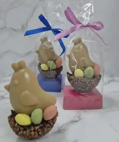 Delicioso chocolate de leche, nido de quinoa con chocolate y huevitos de chocolate rellenos de almendra