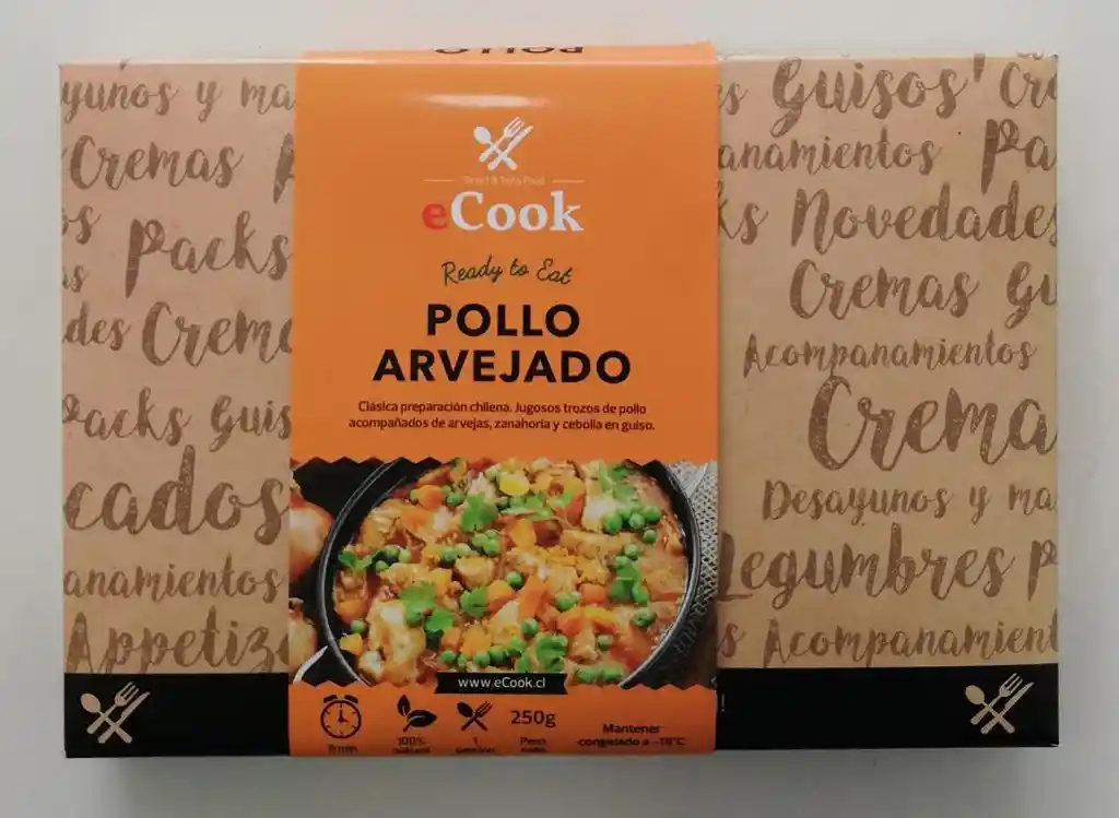 Trozos de pollo acompañados de arvejas, zanahoria y cebolla en guiso. Bolsa al Vacío. Producto congelado, listo para calentar en la misma bolsa y servir.