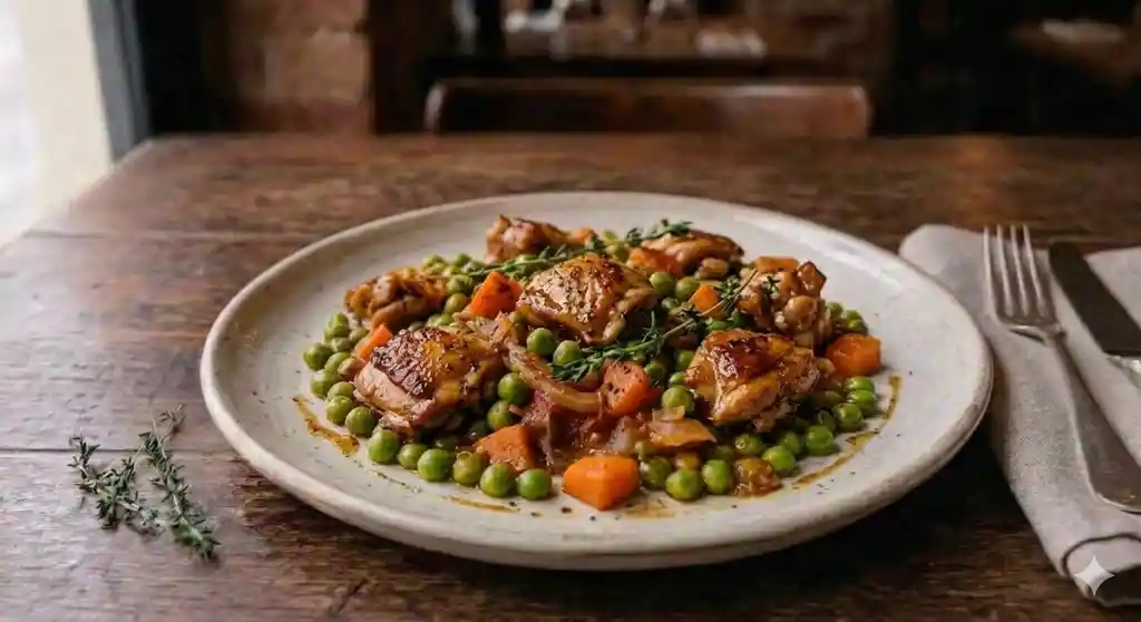 Plato casero de pollo cocido en una salsa suave con arvejas, zanahoria y especias.Destaca por su sabor tradicional, jugosidad y un caldo levemente espeso.Producto viene sellado al vacio y congelado. Formato individual 500 grs aprx.