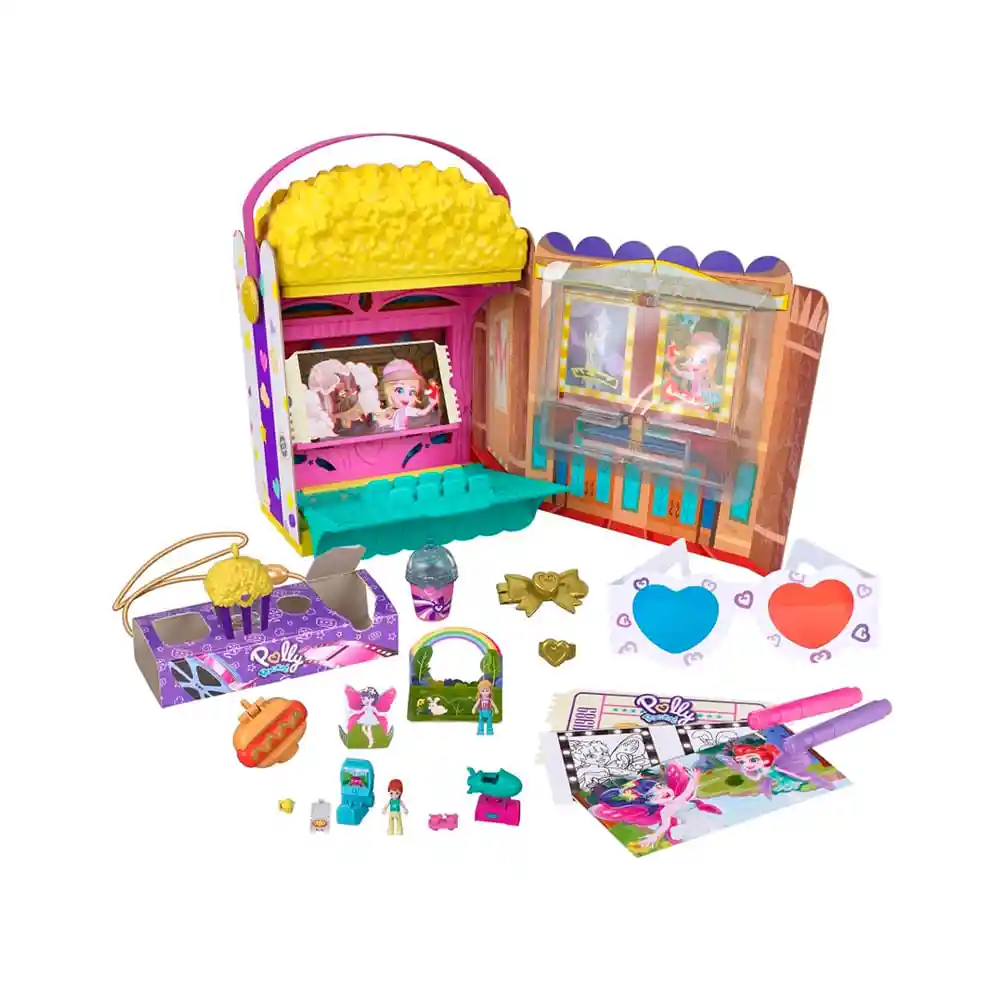 La caja incluye las micromuñecas Polly y Lila, 1 boleto de película, 1 par de lentes 3D, 3 miniaccesorios (anillo, collar y broche para el cabello), 1 paquete de puesto para tomarse fotos, 1 paquete de puesto de películas, 5 accesorios, cine con asientos, puesto de ventas, espacio en la pantalla.