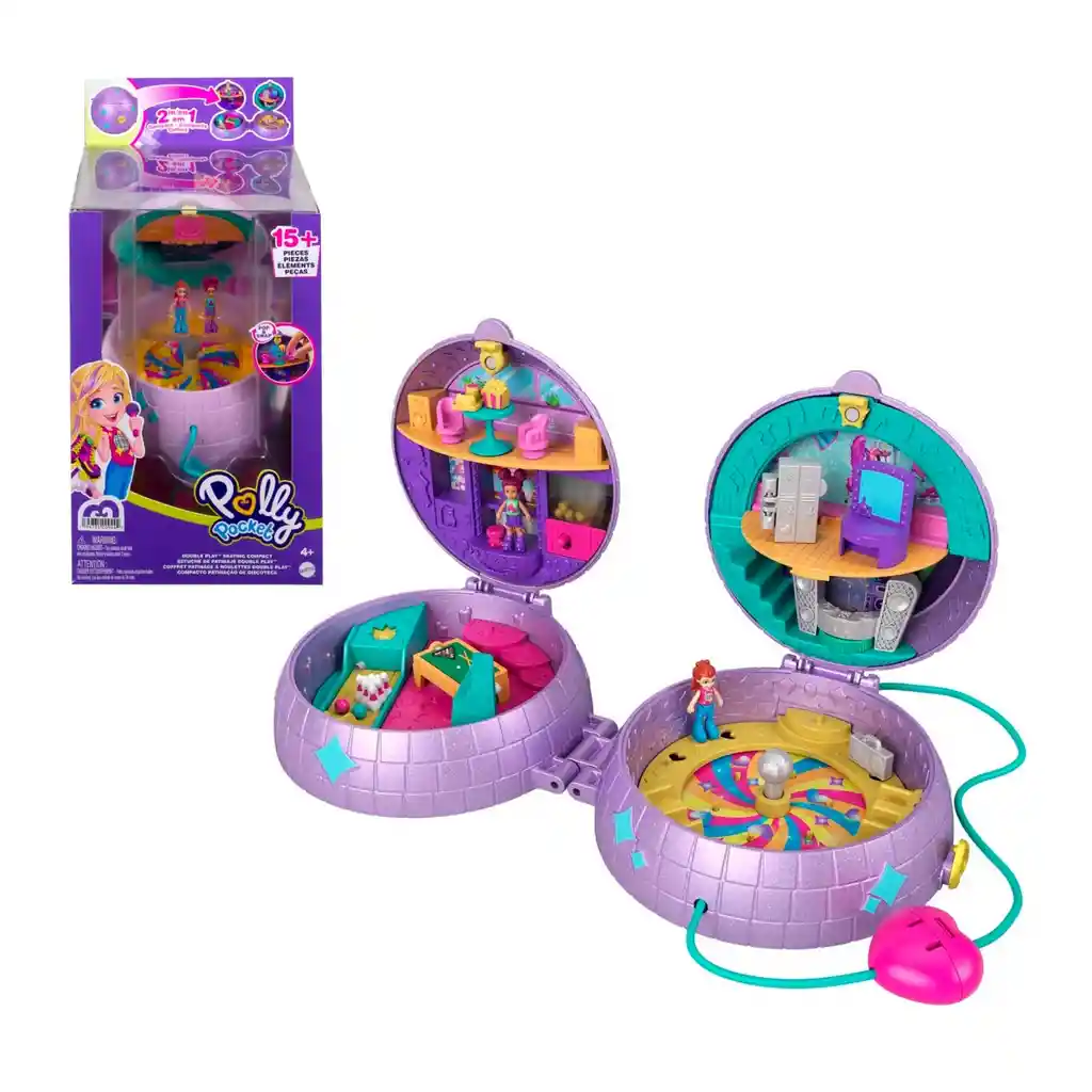 ¡Prepárate para disfrutar de toda la diversión con el estuche Polly Pocket™ Double Play™! Los dos estuches de este surtido (temática de patinaje y espacial) son ideales para jugar en casa o en cualquier lugar. Cada uno tiene actividades y accesorios divertidos en función de los temas relacionados (se venden por separado y están sujetos a disponibilidad). El estuche de patinaje Double Play™ se abre y se despliega en 4 espacios diferentes (es como tener dos estuches en uno) y viene con 2 muñecas, 15 accesorios y 1 atuendo de moda. Además, cuenta con divertidas actividades con temática de patinaje en discotecas. El estuche espacial Double Play™ se abre y se despliega en 4 espacios diferentes (es como tener dos estuches en uno) y viene con 2 muñecas, 15 accesorios y 1 atuendo de moda. Además, cuenta con fantásticas actividades relacionadas con el espacio exterior. ¡Algunos accesorios tienen la función Pop & Swap™ para que las niñas puedan colocarlas en las diferentes áreas de los estuches y divertirse creando un sinfín de historias! ¡Cada estuche también incluye una correa larga para usarlo como bolso y para que las niñas puedan llevarlo donde sea! Los colores y las decoraciones pueden variar. Excelente regalo para niñas de 4 años en adelante.