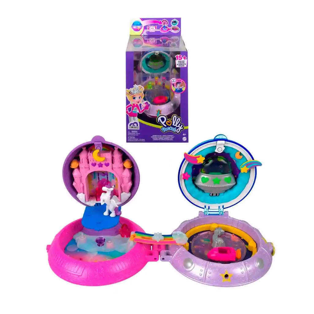 ¡Prepárate para disfrutar de toda la diversión con el estuche Polly Pocket™ Double Play™! Los dos estuches de este surtido (temática de patinaje y espacial) son ideales para jugar en casa o en cualquier lugar. Cada uno tiene actividades y accesorios divertidos en función de los temas relacionados (se venden por separado y están sujetos a disponibilidad). El estuche de patinaje Double Play™ se abre y se despliega en 4 espacios diferentes (es como tener dos estuches en uno) y viene con 2 muñecas, 15 accesorios y 1 atuendo de moda. Además, cuenta con divertidas actividades con temática de patinaje en discotecas. El estuche espacial Double Play™ se abre y se despliega en 4 espacios diferentes (es como tener dos estuches en uno) y viene con 2 muñecas, 15 accesorios y 1 atuendo de moda. Además, cuenta con fantásticas actividades relacionadas con el espacio exterior. ¡Algunos accesorios tienen la función Pop & Swap™ para que las niñas puedan colocarlas en las diferentes áreas de los estuches y divertirse creando un sinfín de historias! ¡Cada estuche también incluye una correa larga para usarlo como bolso y para que las niñas puedan llevarlo donde sea! Los colores y las decoraciones pueden variar. Excelente regalo para niñas de 4 años en adelante.