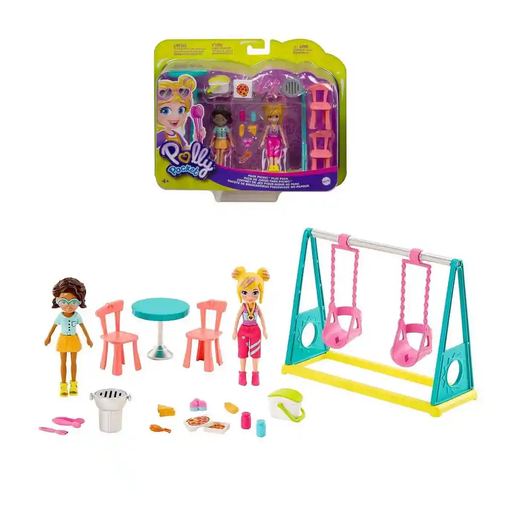 Jugar con muñecas Polly, siempre les ofrece a las niñas crear divertidas historias en donde la diversión es aún más grande cuando compartes con amigos. Ahora podrás pasar interminables horas de juego al aire libre con este Conjunto Aventura en el Parque de Polly Pocket, en donde podrás columpiarte hasta que esté lista la comida. Incluye las muñecas Polly y Shani de 7 cm, un set de columpio, una mesa para pícnic, dos sillas, parrilla, canasta de pícnic y 8 accesorios de comida como pizza, cupcake, bebidas, queso y todo aquello que más nos provoca comer cuando la estamos pasando tan bien.