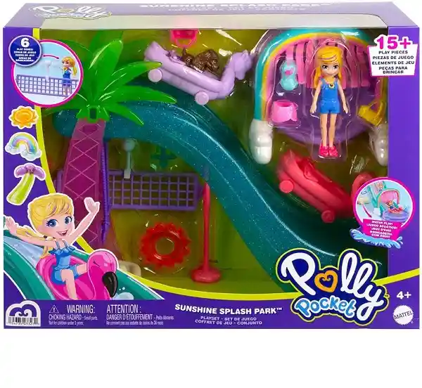 Set Polly Pocket Contiene 17 Unidades. Figura de 8 cm de Polly 1 Und + Figura de su Fiel Mascota Peach 1 Und + Accesorios 15 Und. Accesorios Relacionados Con el Deporte Como Red de Voleibol Con Pelota Columpio Mecedor Escalera de Sogas y Mucho Más. ¡Ten un Diluvio de Diversión Junto a Polly Pocket en el Parque Acuático de Deportes! Esta Aventura Llena de Acción Comienza en el Tobogán de Agua Gigante en el Cual se Pueden Deslizar Con Los Karts de Carrera Con Diseño de Unicornio y Flamenco y Aterrizar en la Piscina. Lo Mejor de Jugar Con Las Muñecas Polly Pocket es Que Los Más Pequeños de la Casa Puede Imaginar y Vivir la Diversión de la Vida Cotidiana de Polly y Sus Amigos Explorando Sus Aventuras Diarias y Favoritas.