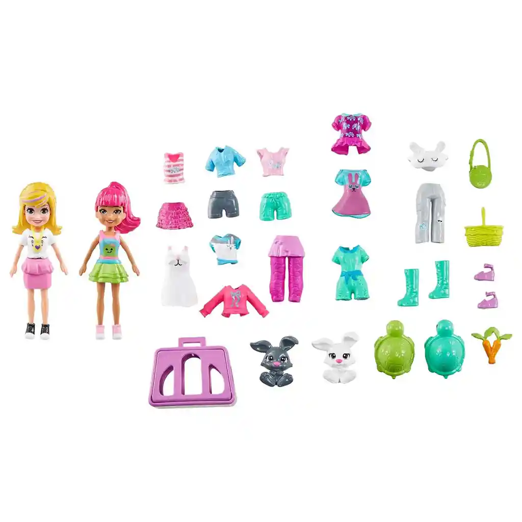 Set Polly Pocket Contiene 24 Unidades. Animalitos 4 Und + Accesorios 20 Und+. Y Conjuntos de Ropa Inspirados la Diversión Tendrá un Nuevo Significado Con Este Increíble Pack de Moda Animales Tiernos de Polly Pocketen Animales Como Camisas Faldas Pantalones Botas Zapatos y Mucho Más Que se Pueden Combinar Para Lograr Más Versatilidad. Las Muñecas de Polly y Margot Tienen Unas Medidas de 7 cm Cada Una Son Super Adorables y Visten Conjuntos Inspirados en un Conejito y en Una Tortuga lo Mejor de Todo es Que su Ropa es Intercambiable Por lo Que Puedes Combinar Sus Atuendos Una y Otra Vez. Lo Mejor de Jugar Con Las Muñecas Polly Pocket es Que Puedes Imaginar y Vivir la Diversión de la Vida Cotidiana de Polly y Sus Amigos Explorando Sus Aventuras Diarias y Favoritas.