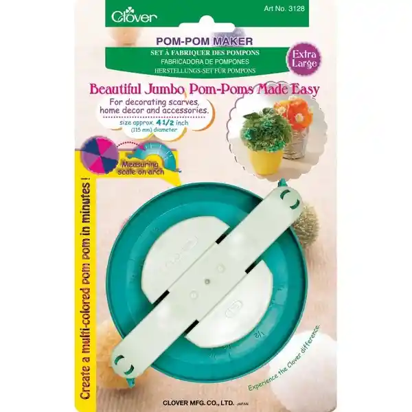 Hermosos y fáciles pompones con las pomponeras Clover. Tamaños: XS: Diámetro de aprox. 3/4 "(20 mm) y 1" (25 mm). S: Diámetro de aprox. 1 3/8 "(35 mm) y 1 5/8" (45 mm). L: Diámetro de aprox. 2 1/2 "(65 mm) y 3 3/8" (85 mm). XL: Diámetro de aprox. 4 1/2 "(115 mm).
