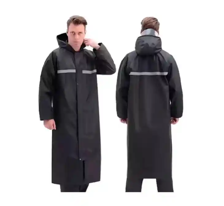 Traje para la lluvia largo . Reflectante en la parte de la espalda para esos dias oscuros y lluviosos . Cubierta de plastico transparente en la capucha para evitar le agua en la cara . Chaqueta larga . Material : PVC . Impermeable para la lluvia . Perfecto para tener en el bolso para cualquier emergencia Poncho impermeable capa de lluvia con gorro . Seguridad y eco-amigable . solo utiliza el material 100% pvc . no tóxico . Talla unica para todos . Compacto y liviano . Diseño abierto con botones . Medidas : - Largo completo 1,30 metros - Largo hasta el hombro 1.10 metros - Ancho de pecho 60cm aprox Contenido de la compra: 1 x Poncho para lluvia impermeable capa para lluvia ( CHAQUETA ) "COLORES AZUL OSCURO Y NEGRO " ENVIAMOS SURTIDOS