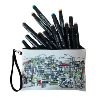 Estuche con ilustración de Valparaíso. Material polyester/ algodón, impreso. Cierre negro y gancho con cinta para colgar. Tamaño estuche : 15 x 24 cm. Incluye 18 scriptos de alta calidad con doble punta.