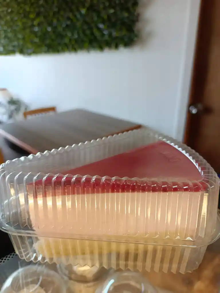 Porción de torta fría de sabor Yogurt de frutilla con base de bizcocho