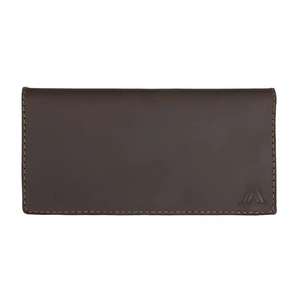 Discreto y funcional. - Compartimiento para chequera - 5 bolsillos de diferentes tamaños para identificaciones y tarjetas. - Cierre estilo solapa. - Elaborado a mano, hecho en Chile. - Material natural con textura lisa. Especificaciones: - Material: cuero. - Color: Marron - Tamaño: 9 cm x 18,5 cm x 1 cm.
