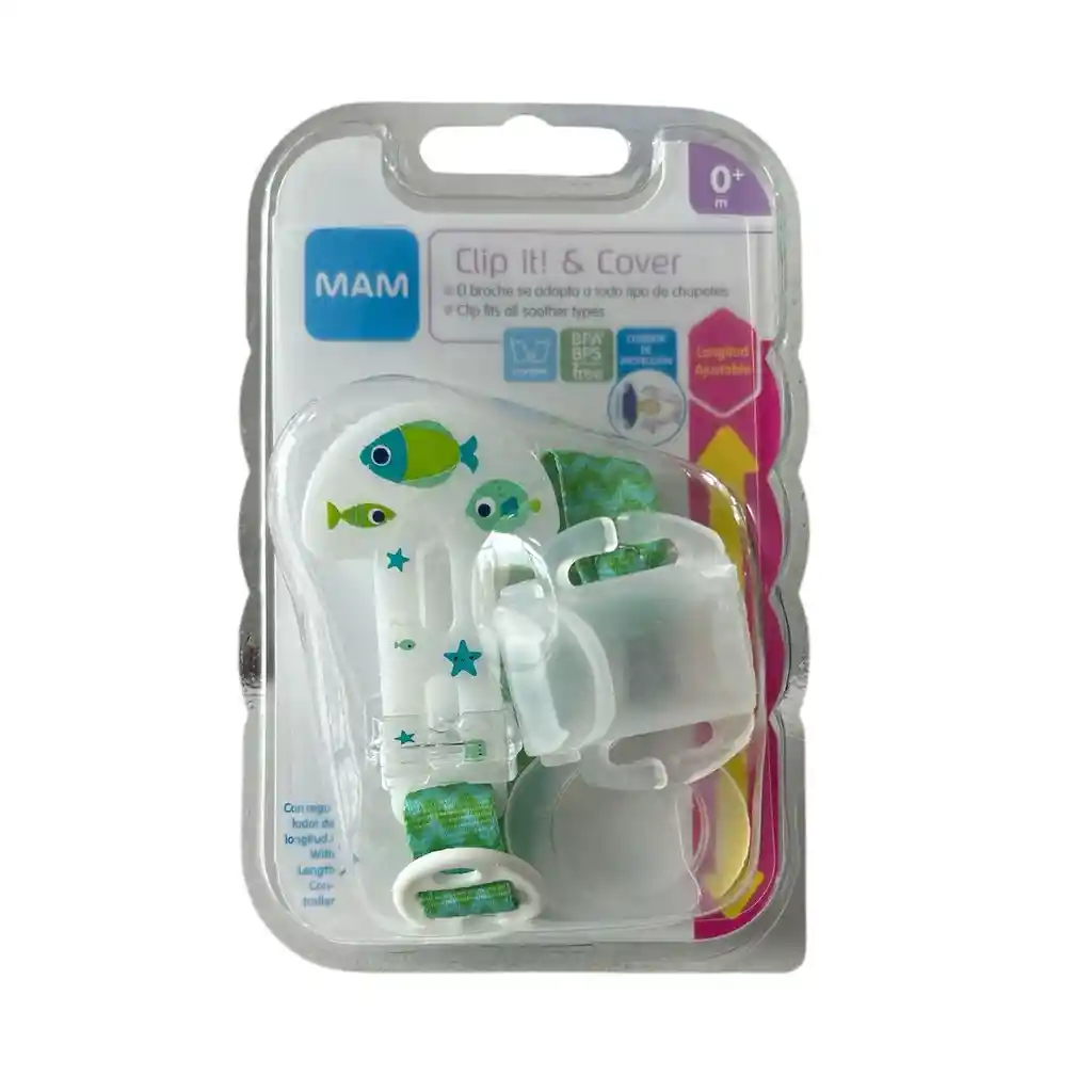 Porta Chupete Clip It Cover Mam. Características: Más estable y versátil que nunca, el nuevo chupetero MAM Clip puede combinarse con diversos tipos de chupetes y otros accesorios para bebés. Gracias a su innovadora característica de longitud ajustable, los padres y madres pueden adaptar el chupetero a cada situación. Como el lazo es flexible, es posible colocar en un abrir y cerrar de ojos chupetes con anilla, mordedores, juguetes y mucho más en el chupetero. La anilla desmontable permite fijar tanto chupetes MAM como cualquier otro tipo de escudos. El nuevo mecanismo de clip se abre automáticamente mientras la corredera se desliza hacia atrás muy fácil con una mano. Protección de tetina para protegerla y mantenerla limpia.