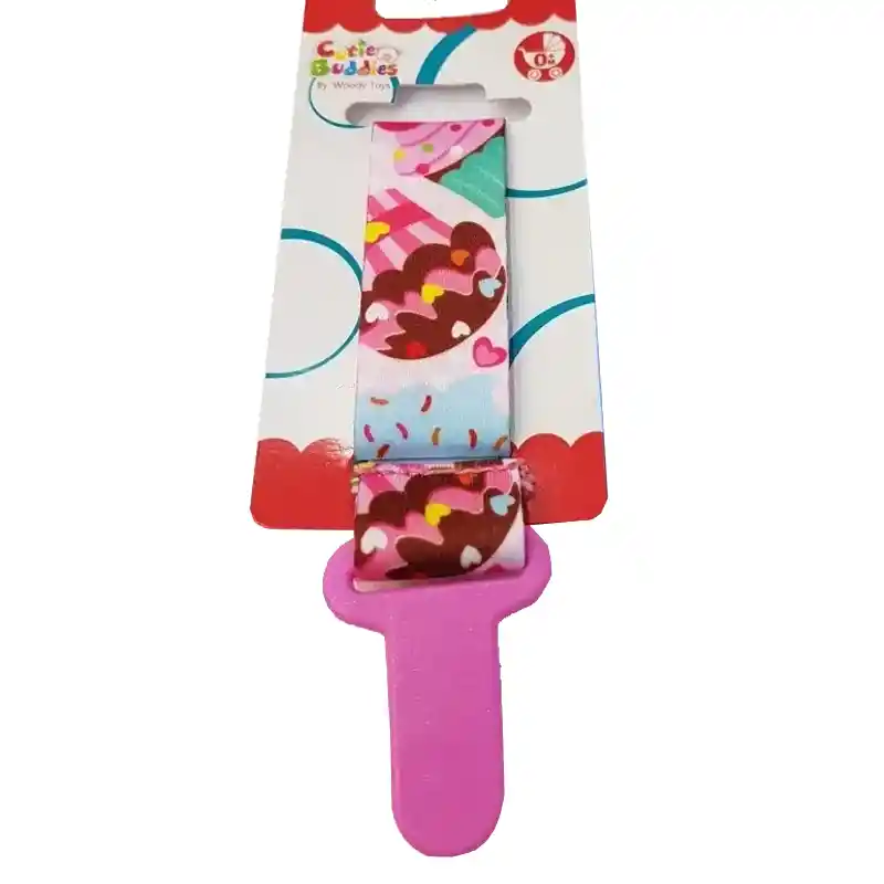 Material: Cinta Género y Plástico Diseños: Cupcake Tamaño: 18 cm por 2.5 cm aprox Contenido: 1 Portachupete de Tela con Clips Con Clip que garantiza que el chupete esté bien fijado Material Libre de BPA seguro para el Bebé